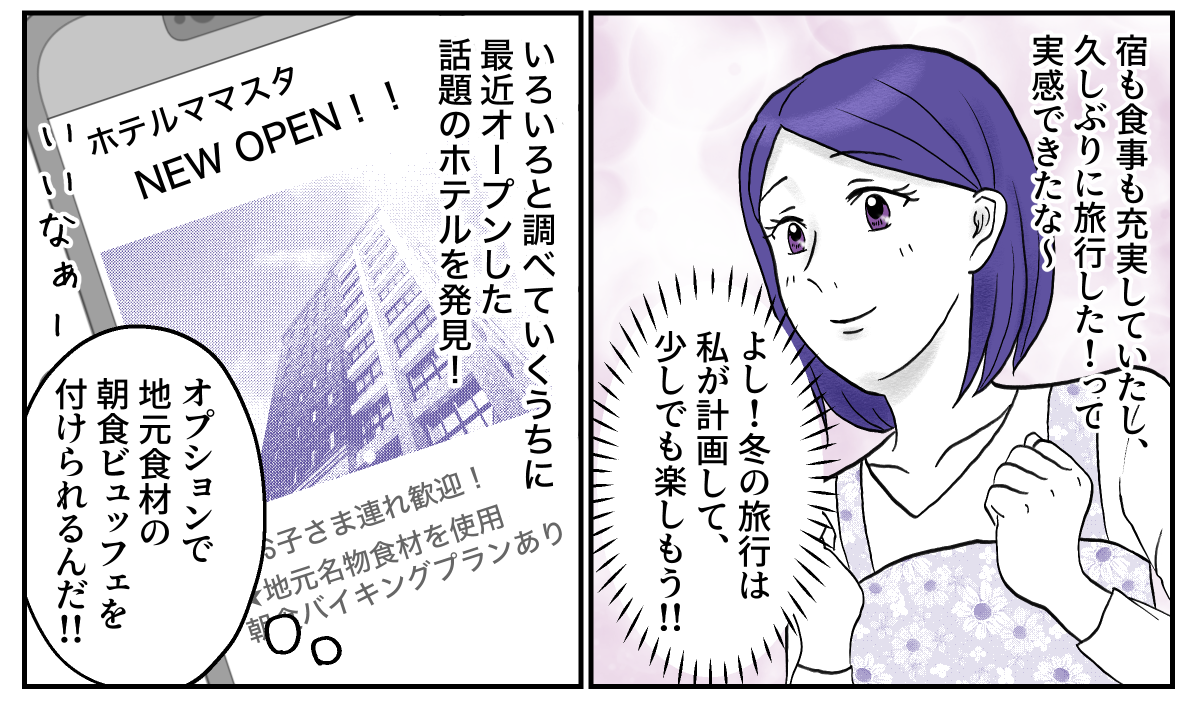 両親との温泉旅行で充実した気分を味わった私は、冬の旅行プランを練り、夫に提案しました。しかし夫は予算を理由に「ムリだな」と一言。あっさり却下された私は、結局いつもどおりの節約家族旅行へ出かけることになりました。