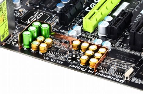 コンデンサ周りをみると、X58プラットフォームのG1-Killerシリーズにはなかった銅製のプレートが追加されている。これは、電磁干渉(EMI)からの保護および干渉電力を防ぐ働きをし、高音解像度で歪みのない音声を楽しむことができる。