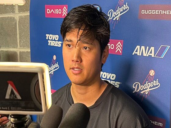 試合後、取材に応じるドジャース・大谷翔平【写真:上野明洸】フルカウント