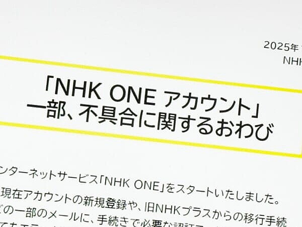 ニューストップ > ライフ総合ニュース > NHKが「NHK ONE」のアカウント登録手続きで不具合 謝罪 テレビ 謝罪 アプリ 放送法 Gmail NEWS NHK おたくま経済新聞 NHKが「NHK ONE」のアカウント登録手続きで不具合 謝罪 2025年10月1日 16時30分 リンクをコピーする NHKは10月1日、新たに始まったインターネットサービス「NHK ONE」のアカウント登録手続きで不具合が発生しているとして謝罪しました。Gmailなど一部のメールに認証コードが届かない、入力してもエラーになるといった問題が確認されており、「原因は調査中」としています。【その他の画像・さらに詳しい元の記事はこちら】■NHKの説明と謝罪内容NHKは発表の中で「ご不便をおかけし申し訳ございません」と謝罪。不具合は現 記事を読む