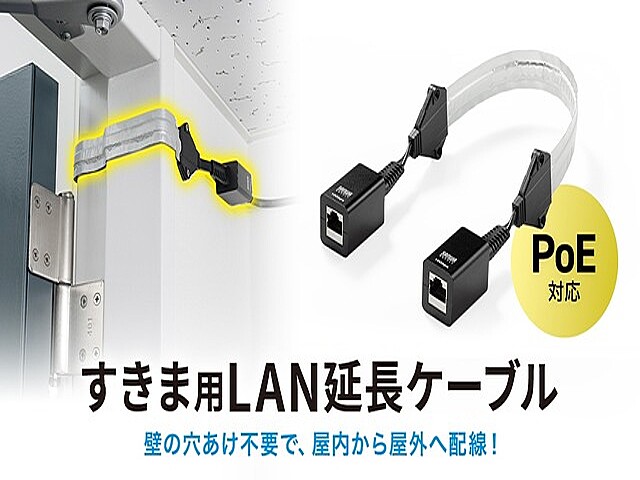 サンワサプライ株式会社は、屋内から屋外への配線を可能にする、超薄型CAT6A 延長LANケーブル「KB-FL6ASTP-EX」を発売した。ドアのすき間を利用して引き込むため、外壁に穴を開ける必要がない。RJ-45メスコネクタを両端に搭載し、アルミテープで強化されたフラットケーブル仕様だ。■外壁への穴あけ不要。LANケーブルをすき間に配線本製品を使用すれば、外壁に穴を開けることなく屋内から屋外にLANケーブルを配線できる。■伝送領