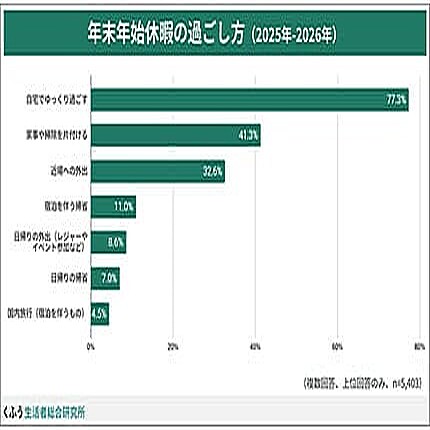 くふうカンパニーホールディングスは12月5日に、同社の運営するくふう生活者総合研究所が、生活者を対象に実施した2025年の年末年始の過ごし方に関する調査の結果を発表した。同調査は、くふうカンパニーが提供する家計簿サービス「くふう Zaim」のユーザー、およびチラシ・買い物情報サービス「くふう トクバイ」ユーザー計5403名に対して、11月28日〜12月1日の期間に行われている。●約9割の人が「年越しそばを食べる」。半数