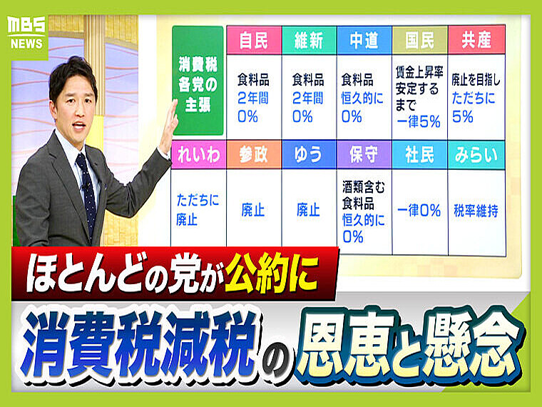 ニューストップ > 国内ニュース > 社会ニュース > 消費税減税は本当に暮らしにプラスになるのか?各党の主張の違いは 保守 所得税 消費税 物価 市場 保険 考え方 性格 衆議院選挙 外為 円安 家族 富裕層 MBSニュース 消費税減税は本当に暮らしにプラスになるのか?各党の主張の違いは 2026年1月28日 6時0分 リンクをコピーする by ライブドアニュース編集部 ざっくり言うと この記事の見出しと要約はライブドア社が開発したAIにより自動生成されたものです。実験的な機能のため、記事本文と併せてご確認ください。 衆院選の最大の争点となっている「消費税減税」について識者が解説している 多くの政党が公約に掲げているが、細かく見ると「対象」や「期間」に違いが 食品のみを対象とする案は、低所得者支援の性格が強いと識者は指摘した 記事を読む
