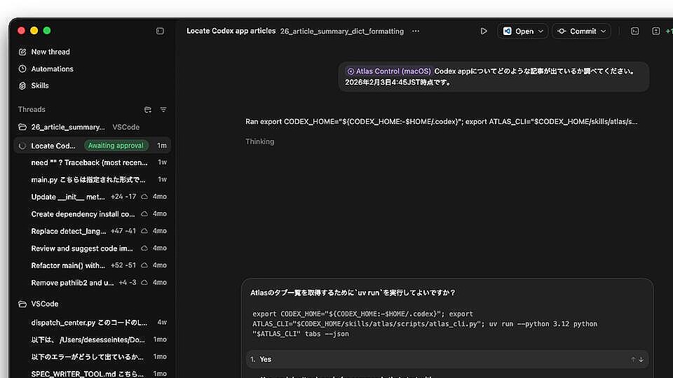 ニューストップ > IT 経済ニュース > ガジェットニュース > コード生成からナレッジワークへ 開発者以外の人も活用可能に 生成AI ChatGPT モデル アプリ やらせ エンジニア PDF au ブラウザ ガジェット ギズモード・ジャパン コード生成からナレッジワークへ 開発者以外の人も活用可能に 2026年2月3日 6時30分 リンクをコピーする Mac版CodexアプリでAIにブラウザ(ChatGPT)を用いた調査を依頼しているところ Image: かみやまたくみ コーディングエージェントからナレッジワークツールへ。2026年2月3日、OpenAIがmacOS向けアプリ「Codex」を発表しました。Codexはもともと、AIを用いたプログラム開発のためのツールでしたが…今回登場したMac用アプリは元のコンセプトから逸脱気味なのが特徴です。端的に言えば、Codexは 記事を読む