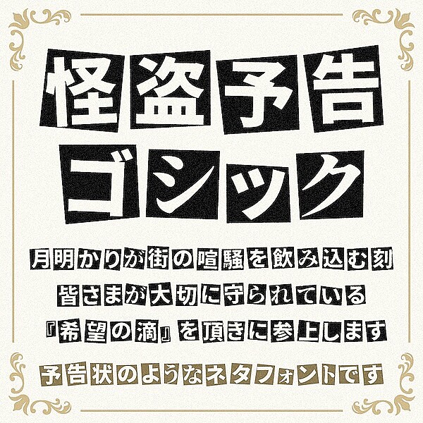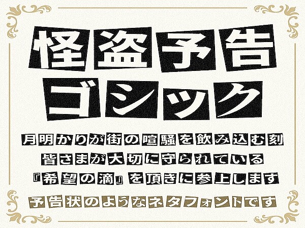ニューストップ > ライフ総合ニュース > ロマンを簡単に実現できるフォント「怪盗予告ゴシック」が登場 タカタ スパイ 警察 広告 黒い四角 散歩 SNS キーボード 激怒 おたくま経済新聞 ロマンを簡単に実現できるフォント「怪盗予告ゴシック」が登場 2026年2月4日 9時12分 リンクをコピーする フィクションの怪盗が犯行前に警察などに出す予告状といえば、筆跡から本人を特定できないよう、新聞記事から任意の文字を切り抜くのが定番。文書作成ソフトが発達した現代ではそんな面倒なことをせずともキーボードをカタカタやれば簡単に作れますが、やっぱりあの歪な文字列はロマンです。そんなロマンを簡単に実現できるフォントが登場しました。【その他の画像・さらに詳しい元の記事はこちら】ネット上で数々の独自フォ 記事を読む