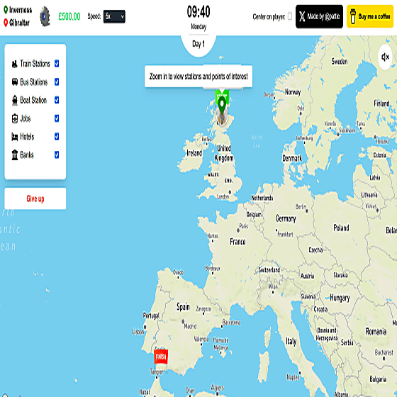 公共交通機関だけを使ってある地点から別の地点まで移動する速さを競うブラウザゲーム「Geo Racers」が公開されていたので、実際にどんなゲームになっているのか遊んで確かめてみました。Race from one side of the world to the other - Geo Racershttps://geo-racers.com/Geo Racersにアクセスすると、以下のように名前の入力が求められます。好きな名前を入力して「Play as Guest(ゲストとしてプレイする)」をクリック。すると