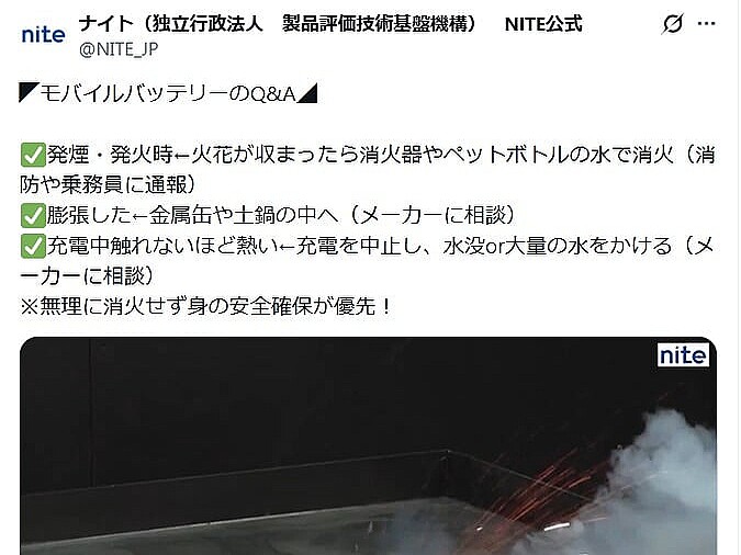 ニューストップ > IT 経済ニュース > 経済総合ニュース > モバいるバッテリーが急に発火したら「水をかけて消火」OKなのか 雑学・トリビア ネット・ITニュース モバイルバッテリー オトナンサー モバいるバッテリーが急に発火したら「水をかけて消火」OKなのか 2026年2月19日 22時15分 リンクをコピーする 近年、電車内や航空機内などでモバイルバッテリーが発火する事故が相次いでいます。そんな中、手持ちのモバイルバッテリーから煙や火が出たときの対処法について、独立行政法人製品評価技術基盤機構(NITE)がXの公式アカウントで紹介しています。【動画】急に「モバイルバッテリー」が発火…すぐに水をかけてはいけない“理由”がコレです!NITEによると、モバイルバッテリーに異変が生じたときの対処法は次の通りです。■発 記事を読む