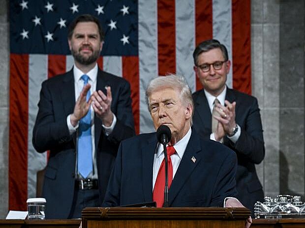 上下両院合同会議で2期目初の一般教書演説を行うトランプ米大統領(手前)=24日、ワシントン(ゲッティ=共同)【ワシントン共同】トランプ米大統領は24日(日本時間25日)、上下両院合同会議で2期目初の一般教書演説に臨み、看板政策の高関税措置を続けると明言した。最高裁が違法判決を出したことを「非常に残念だ」と批判。「代替策」はより強力なものになるとし「ほぼ全ての国と企業が関税合意を維持したがっている」と主張