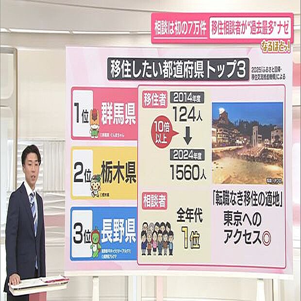 ニューストップ > 国内ニュース > 社会ニュース > 「移住希望地」人気ランキング、1位は2年連続で群馬「転職なき移住の… 日光東照宮 調味料 物価 なるほど アナウンサー イベント 値上げ 相談 結婚 温泉 食卓 日テレNEWS NNN 「移住希望地」人気ランキング、1位は2年連続で群馬「転職なき移住の適地」 2026年2月25日 21時21分 リンクをコピーする 「news every.」の山粼誠アナウンサーが、ニュースの気になる情報をお伝えする「なるほどッ!」。25日のテーマは、「移住相談者が“過去最多”ナゼ?」です。■移住相談者が増加中山粼誠アナウンサー「移住を考えている人の相談数のグラフを見ると、移住希望者がかなり増えています。2009年が3823件でした。去年が7万3003件と前年より1万件以上もアップし、過去最多となりました。移住を支援する団体(ふるさと回帰・ 記事を読む