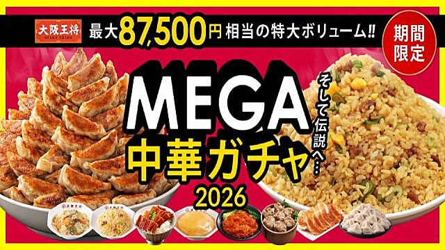 ニューストップ > ライフ総合ニュース > 大阪王将のMEGA中華ガチャ開始 ダム キャンペーン ショッピング うなぎ カレー 市場 温泉 餃子 大阪王将 唐揚げ 天津 オリコンニュース 大阪王将のMEGA中華ガチャ開始 2026年2月26日 13時5分 リンクをコピーする by ライブドアニュース編集部 ざっくり言うと この記事の見出しと要約はライブドア社が開発したAIにより自動生成されたものです。実験的な機能のため、記事本文と併せてご確認ください。 大阪王将が通販サイトなどで26日から「大阪王将MEGA中華ガチャ2026」を販売 最大8万7500円相当の商品が当たるキャンペーンで、価格は6500円 目玉は「直火炒め炒飯」100人前と「元祖肉餃子」1000個が入ったセットだ 記事を読む