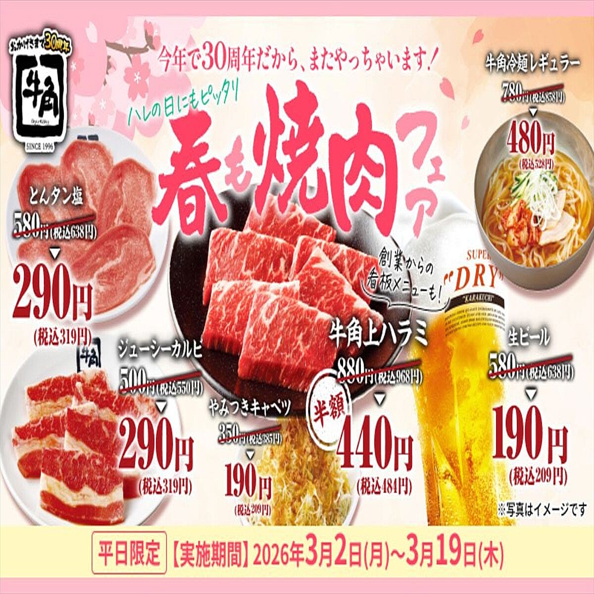 ニューストップ > ライフ総合ニュース > 牛角で平日限定「春も焼肉フェア」3月2日から開催へ…特別価格の商品… 牛角 お得・激安情報 トレンド オトナンサー 牛角で平日限定「春も焼肉フェア」3月2日から開催へ…特別価格の商品も 2026年2月26日 19時15分 リンクをコピーする レインズインターナショナル(横浜市西区)の焼肉チェーン「牛角」が、平日限定のフェア「春も焼肉フェア」を3月2日から期間限定で実施します。【画像】「豪華すぎ!」これが、特別価格の全17品です!本企画では、「アサヒスーパードライ(中ジョッキ)」や「牛角上ハラミ(タレ・塩ダレ)」、「ジューシーカルビ」といった人気メニュー、焼肉の定番メニュー全17品が209円(以下、税込み)、319円、429円、484円、528円の特 記事を読む