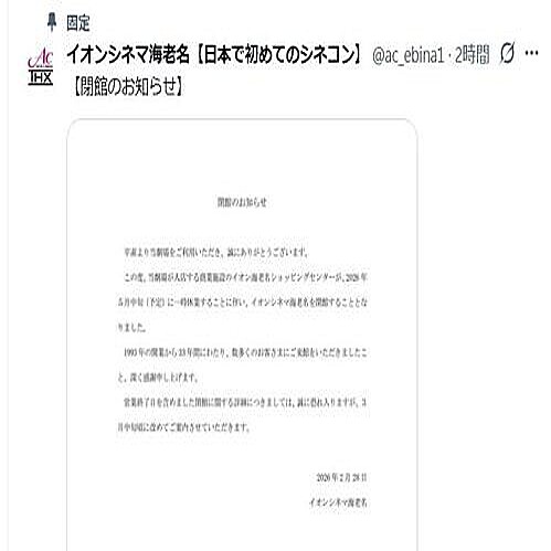 神奈川県海老名市で1993年(平5)に開業した、日本で初めてのシネコン・イオンシネマ海老名が28日、公式サイトとSNSで閉館すると発表した。「この度、当劇場が入店する商業施設のイオン海老名ショッピングセンターが、2026年5月中旬(予定)に一時休業することに伴い、イオンシネマ海老名を閉館することとなりました」と報告。「1993年の開業から33年間にわたり、数多くのお客さまにご来館をいただきましたこと、深く感謝申し上げ