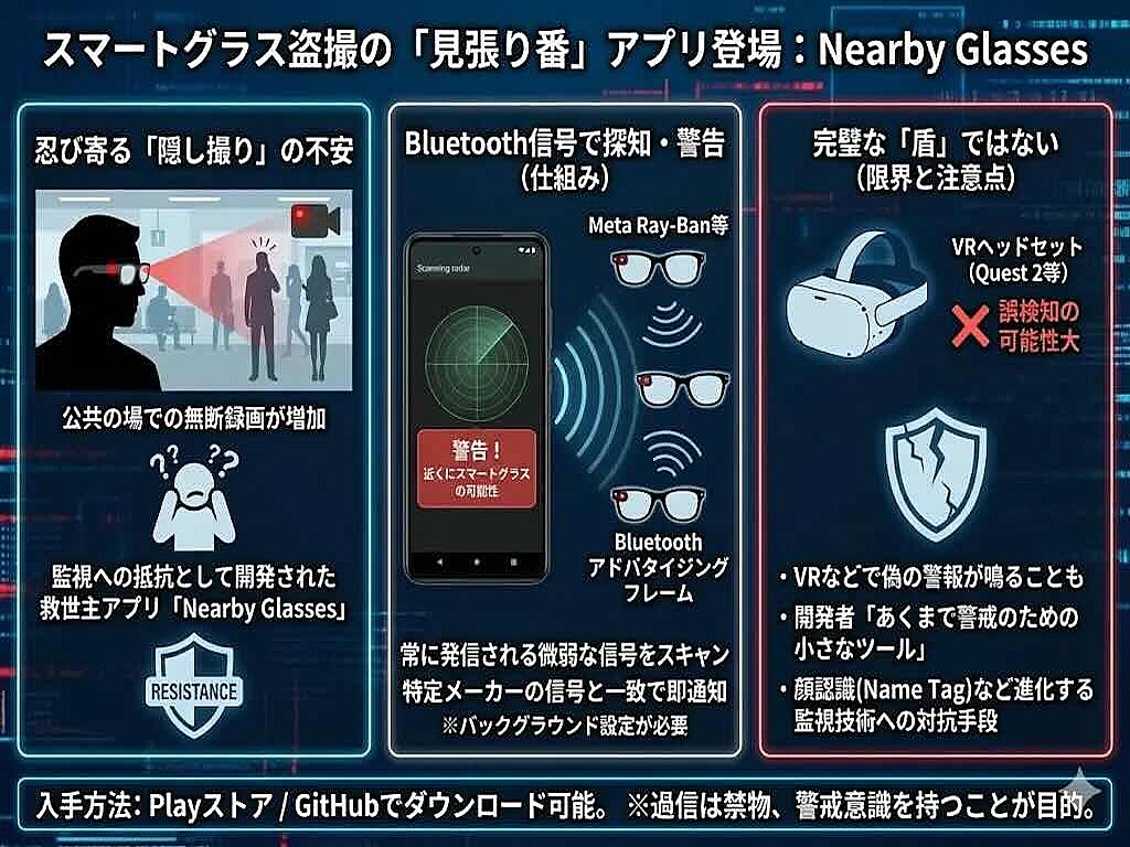 ニューストップ > ライフ総合ニュース > 近くにスマートグラスをかけている人がいると通知するアプリ 公開 タント アプリ Google Play プライバシー 盗撮 Bluetooth GetNavi web 近くにスマートグラスをかけている人がいると通知するアプリ 公開 2026年3月2日 7時0分 リンクをコピーする 自分の近くでスマートグラスをかけている人がいることを知らせるアプリ「Nearby Glasses」が公開されました。 Nearby Glassesは、スマートグラスが発信する小さなデータパケット「Bluetooth Advertising Frames」を探し出し、特定のメーカーのパケットを検出すると通知する仕組み。 このアプリはバックグラウンドで動作します。スキャンを開始すると、デバッグログが検出内容を表示。スマートグラスが近くにあると、「ス 記事を読む