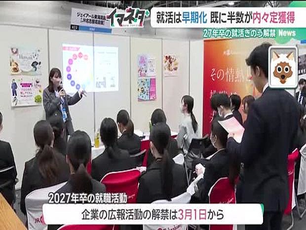 ニューストップ > 国内ニュース > 社会ニュース > 2027年春に卒業予定の学生たちに向けた就職活動が解禁 大学3年生は約… 生成AI 調査結果 市場 トレンド 相談 名古屋市 マイナビ いたずら 就活 メ〜テレニュース 2027年春に卒業予定の学生たちに向けた就職活動が解禁 大学3年生は約半数 2026年3月2日 17時46分 リンクをコピーする メ~テレ(名古屋テレビ) 2027年春に卒業予定の学生たちに向けた就職活動が、3月1日から解禁になりました。就活の「早期化」だけでなく、今年はこれまでと違った動きも。 3月1・2日に名古屋市港区のポートメッセなごやで行われたのは、就活情報サービスなどを手掛ける「マイナビ」が主催する合同企業説明会。 参加企業は東海地方ゆかりの400社ほど。約5000人の学生が来場する見込みです。 今年も売り 記事を読む