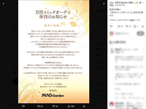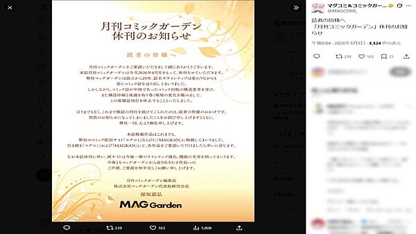 株式会社マッグガーデンが発行する漫画雑誌「月刊コミックガーデン」が、今号となる2026年4月号をもって休刊することが、公式Xおよび公式サイトにて発表されました。【その他の画像・さらに詳しい元の記事はこちら】■コミック出版の構造変革や流通環境の変化が背景に月刊コミックガーデン編集長兼株式会社マッグガーデン代表取締役会長である保坂嘉弘氏の署名で出された「『月刊コミックガーデン』休刊のお知らせ」によると