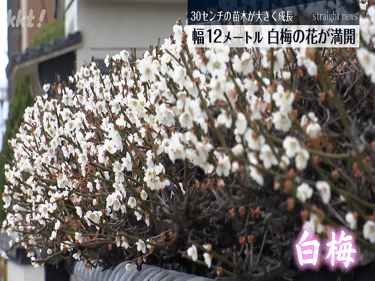 菊池市隈府の堤 照さんの家の外壁には、12メートルほどにわたって白梅の木が枝を伸ばし、いま、白い花を咲かせています。この白梅は、当初は30センチほどの苗木でしたが、毎朝6時からの手入れを続けて丹念に育てたところ、枝をどんどん伸ばし、1本の梅の木がここまで成長したということです。 堤 照さん「私の生きがいですね。あと100歳までなんとかして、(梅と)遊ぶと長生きするだろうと思う。」