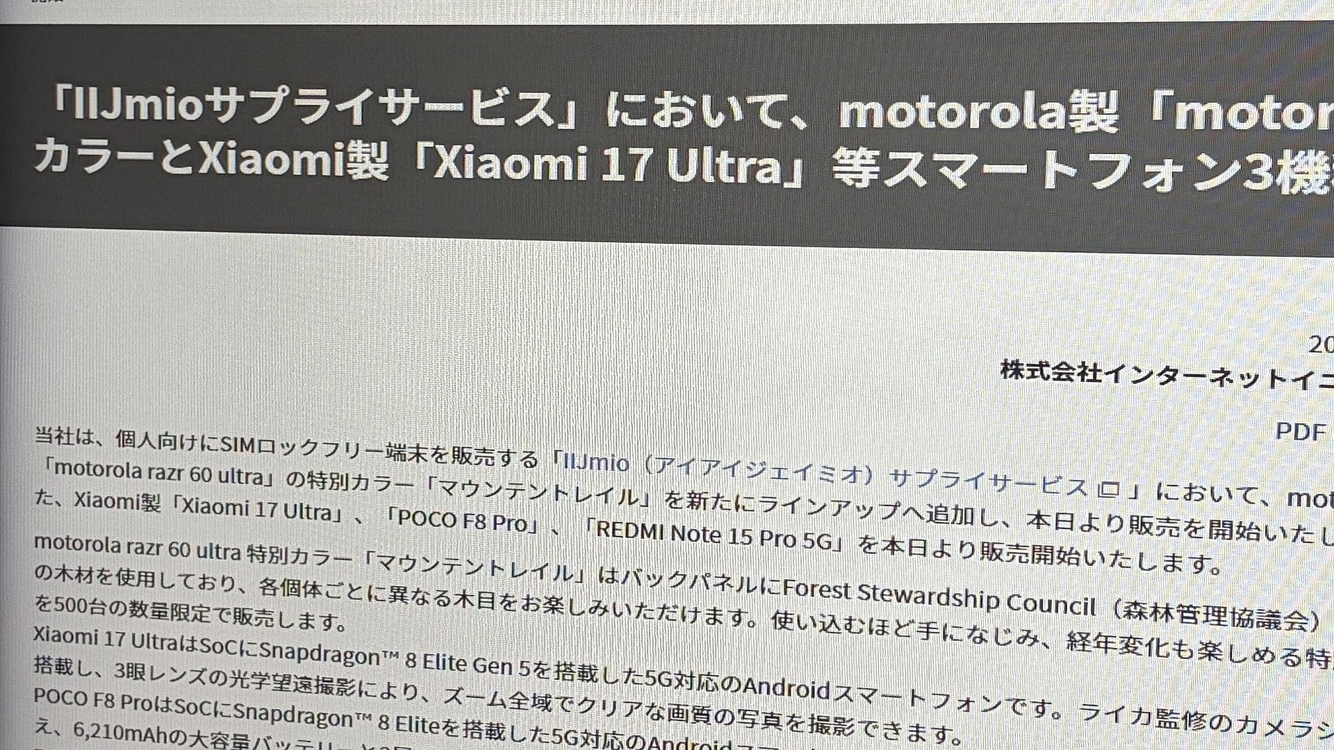 インターネットイニシアティブ(IIJ)は、個人向け端末販売「IIJmioサプライサービス」で、「Xiaomi 17 Ultra」を発売した。このほか、「motorola razr 60 ultra特別カラー」、「POCO F8 Pro」、「REDMI Note 15 Pro 5G」も発売された。 「Xiaomi 17 Ultra」は、XiaomiのAndroidスマートフォン。価格は、16GB+512GBモデルの一括価格が19万8800円、24回払いが月8328円。16GB+1TBモデルの一括価