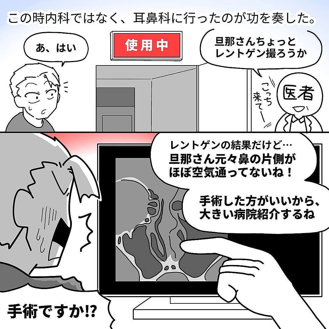 やまみーさんの漫画「鼻中隔湾曲症で手術をした話」(全4話)が、インスタグラムで合計5000以上の「いいね」を集めて話題となっています。【漫画】本編を読む「鼻が詰まって息ができない」という夫を、妻が耳鼻科に連れていきました。診察の結果、片側の鼻にほぼ空気が通っていないことが判明。簡単な手術で治ると言われましたが……という内容で、読者からは「私も同じ治療を受けました」「共感しかない!」などの声が上がっ