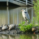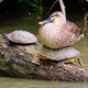 倒木でカルガモがくつろいでおり、丸まった体の下には亀が