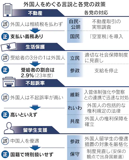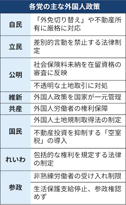 参政党は、「外国人への生活保護の停止」と明記。同党の初鹿野裕樹・神奈川選挙区候補は「外国人は生活保護で優遇されている」(11日の街頭演説)と語りました。