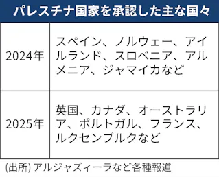 国際社会が長年支持してきた2国家解決が「消滅寸前だ」(仏大統領府高官)という危機感も承認につながった。トランプ米政権内ではガザをリゾート地などとして開発する計画が検討されているほか、イスラエルでもヨルダン川西岸の併合計画が浮上する。