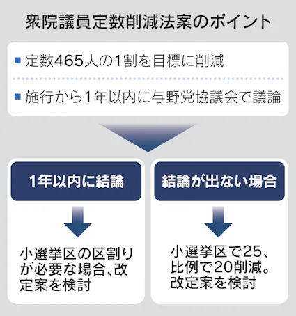 維新は自民党と連立政権を組む際、同法案を「最重要項目」と位置付けた。連立合意書には「1割を目標に衆院議員定数を削減するため、臨時国会に議員立法で法案を提出し成立を目指す」と明記した。