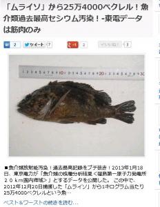 2012年12月、福島原発から北に約20キロ離れた沖合で獲れたアイナメが、1キロあたり2万5800ベクレルの放射線を検出し過去最高でした。。。。と思ったら、2013年1月、福島第1原発の専用港湾内で2012年12月に実施した東電による魚介類のサンプリング調査で、カサゴに似たムラソイから、放射性セシウムが1キロあたり25万4000ベクレル検出されました。