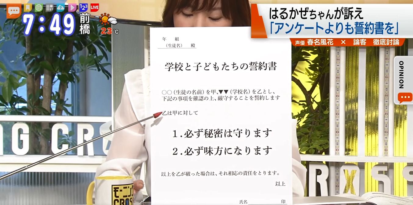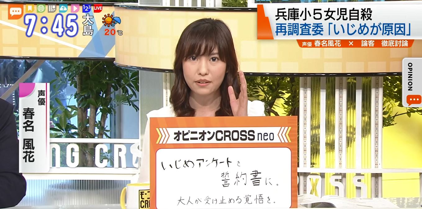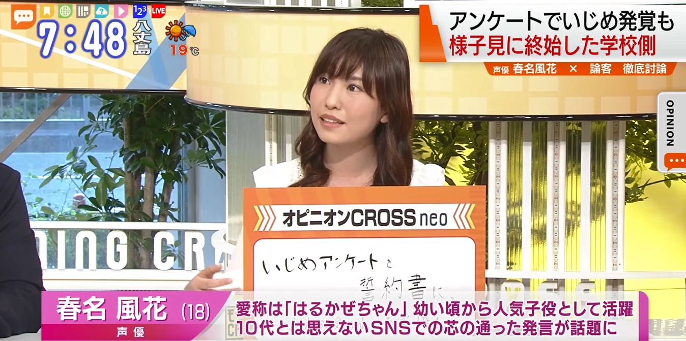 TOKYO MX(地上波9ch)朝のニュース生番組「モーニングCROSS」(毎週月~金曜7:00~)。4月18日(木)放送の「オピニオンCROSS neo」のコーナーでは、声優の春名風花さんが、学校における“いじめアンケート”の問題点について意見を述べました。