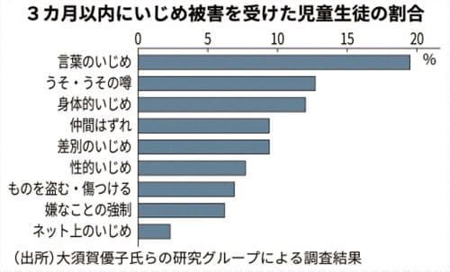 研究グループが開発した調査方法を使い、小学4年~中学3年の2234人にアンケートを行ったところ、36%の児童生徒が3カ月以内に何らかのいじめを受けていた。9類型の中では「言葉のいじめ」(19.5%)が最も多く、「うそ・うその噂」(12.7%)、「身体的いじめ」(12.0%)が続いた。