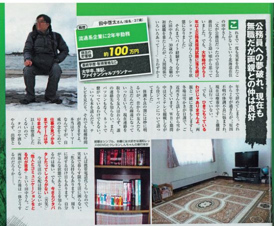週刊SPA!’13年4/2号の田中さんの記事。2年半の会社員時代の貯金は必要最小限しか手をつけておらず、今も100万円以上残っているとか