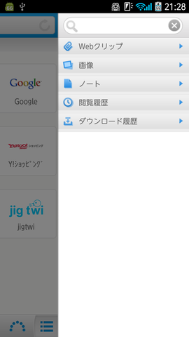 画面右下のメニューマークをタップすると、各種機能にアクセスすることができます。特に、「Webクリップ機能」は、フィーチャーフォンでいう「画面メモ」に相当する機能で、表示しているページを内蔵ストレージやSDカードに保存してオフラインでも閲覧できます。