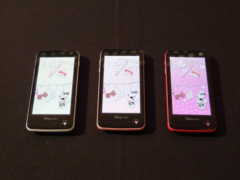 各色ともに、背面にはミニーが描かれています。内蔵コンテンツも、ミニーのものが中心になるそうです。おサイフケータイ(モバイルFeliCa)も完備です。