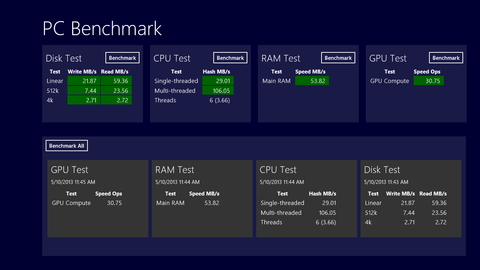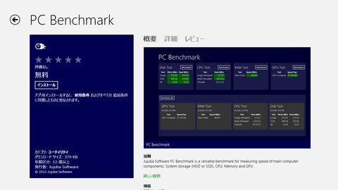 そこで、今回は、Jujuba Softwareが無償で配布している「PC Benchmark」を使うことにしました。Windows RT環境でのベンチマークテストアプリ不足を受けて開発されたようで、ディスクの読み書き速度、CPUの計算速度、RAM(システムメモリー)の読み書き速度、GPUの処理速度をテストすることができます。
