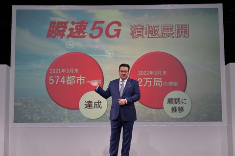 NTTドコモでは今年5月に開催した「2021夏 新サービス・新商品発表会」にて2021年3月末に574都市で5Gが利用できるようになり、2022年3月末までに2万局の5G基地局の構築に向けて順調に推移しており、5Gの人口カバー率も2022年3月末に55%、2023年3月末に約70%、2024年3月末に約80%をめざすことを明らかにしています。