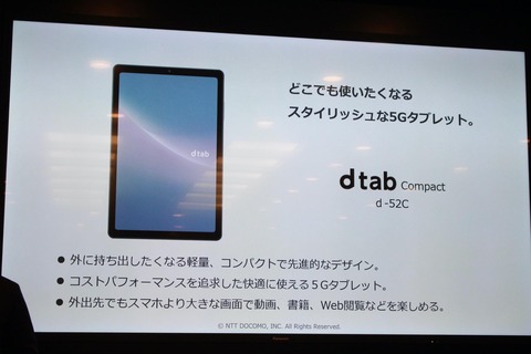 NTTドコモ、5G対応の8.4インチAndroidタブレット「dtab Compact d-52C」を発表!5000mAhバッテリーや背面・前面に800万画素カメラなど