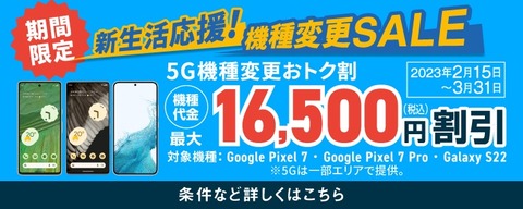対象機種は5G対応スマートフォン(スマホ)「Pixel 7」および「Pixel 7 Pro」(ともにGoogle製)や「Galaxy S22 SCG13」(Samsung Electronics製)の3機種。適用条件は直近のご購入機種を12カ月目以上利用していることに加え、対象料金プランおよび対象の「故障紛失サポート」に新たに加入するかすでに加入していていて継続することとなっています。