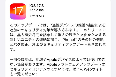 更新は従来通り各製品本体のみでOTA(On-The-Air)によりダウンロードで行え、方法としては、「設定」→「一般」→「ソフトウェア・アップデート」から行え、単体でアップデートする場合のダウンロードサイズは手持ちのiPhone 13 Pro MaxでiOS 17.2.1からだと772.9MBとなっています。またiTunesをインストールしたWindowsおよびMacとUSB-Lightningケーブルで接続しても実施できます。なお、Appleが案内しているアップデートの内容およびセキュリティーコンテンツの修正は以下の通り。