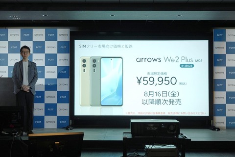 Lenovo Group(以下、レノボ)傘下のFCNTは8日、都内にて『すべての人に「やさしいテクノロジー」を 「arrows We2 シリーズ」発売直前 arrows 販売戦略発表会』を開催し、同社が展開する「arrows」ブランドにおける新商品として5Gに対応した最新ミッドハイレンジスマートフォン(スマホ)「arrows We2 Plus」のオープン市場向けメーカー版(いわゆる「SIMフリーモデル」)「arrows We2 Plus M06(アローズ ウィーツー プラス エムゼロロク)」を発表しています。発売日は2024年8月16日(金)より順次とのこと。