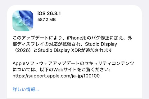 AppleがiPhoneやiPadなど向け最新プラットフォーム「iOS 26.3.1」と「iPadOS 26.3.1」を提供開始!Studio Display XDR対応など