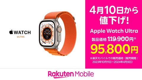 楽天モバイルは10日、同社が販売するスマートウォッチ「Apple Watch Ultra」(Apple製)の公式Webサイトおよび楽天モバイルショップにおける価格(金額はすべて税込)を2024年4月10日(水)9時より改定したとお知らせしています。これにより、改訂前の119,900円から24,100円値下げされて改定後は95,800円となっています。