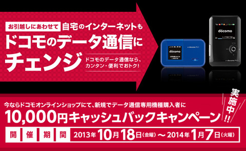 | ドコモオンラインショップにてデータ通信製品キャッシュバックキャンペーンが来年1月7日まで実施! |