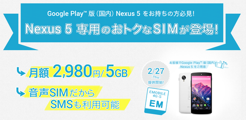 昨年、注目した話題の1つにGoogleブランドのSIMフリースマートフォン「Nexus 5」の国内発売と、イー・アクセス(現ワイモバイル)がイー・モバイル向けにSIMフリーかつ特に携帯電話会社のカスタマイズが入らない状態で「Nexus 5 EM01L」として発売したというのがあったが、イー・モバイル版は付属するSIMカード(契約)に制限があり、例えば、Google Playで購入した「Nexus 5 LG-D821」に装着しても利用できないようになっていました。