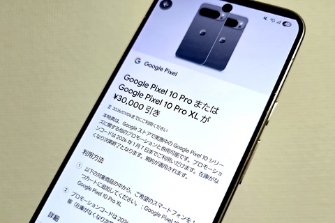 グーグル(以下、Google Japan)が運営する日本向けGoogle公式Webショップ「Google ストア」( https://store.google.com/ )において対象のPixel製品が30,000円引きになる特典を一部の人に提供しています。対象製品は5G対応スマートフォン(スマホ)「Pixel 10 Pro」または「Pixel 10 Pro XL」の2機種とのこと。
