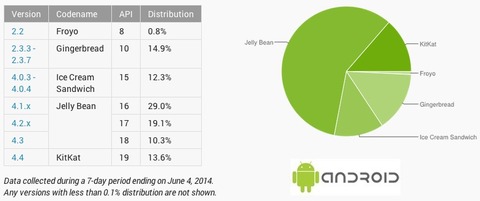 それによると、急激に最新バージョンのAndroid 4.4(開発コード名:KitKat)が先月に続いて5.1%とかなり増加し、13.6%となっています。