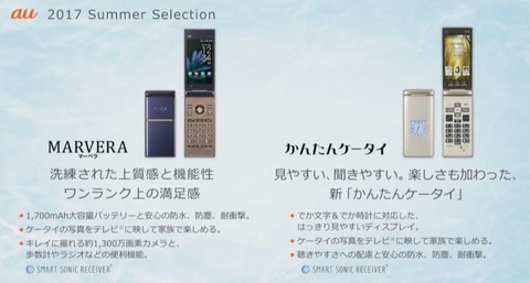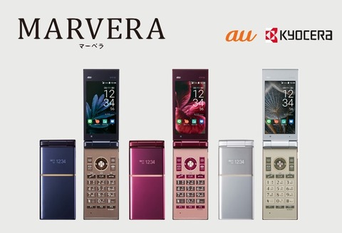 KDDIおよび沖縄セルラー電話は7日、今夏以降に発売する新商品のau向け「2017年夏モデル」のうちの高速通信「4G LTE」および高音質通話の「au VoLTE」、FMラジオやTVにワイヤレスで画像を映し出せる新機能「テレビde写真」に対応した従来型携帯(フィーチャーフォン)「MARVERA(型番:KYF35)」と「かんたんケータイ KYF36」(ともに京セラ製)を2017年8月10日(金)に発売すると発表しています。