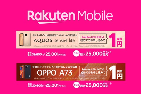 また公式Webサイトでは同社が移動体通信事業者(MNO)として自社回線(以下、楽天回線)を構築して提供している携帯電話サービス「Rakuten UN-LIMIT VI」とセットで購入すると、Galaxy S10 SM-G973Cは最大20,000ポイント還元で実質14,980円、OPPO A73 CPH2099は最大15,000ポイント還元で実質1円となっており、楽天モバイル 楽天市場店では同様にRakuten UN-LIMIT VIとセットで購入すると、OPPO A73 CPH2099はが最大20,000ポイント還元で実質0円以下となっています。