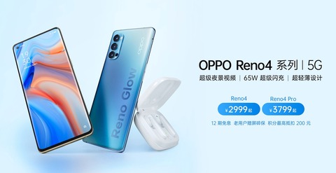 OPPO Mobile Telecommunications(以下、OPPO)は5日(現地時間)、オンライン発表会を開催して5Gに対応した新しいフラッグシップスマートフォン(スマホ)「OPPO Reno4(型番:PDPM00およびPDPT00)」と「OPPO Reno4 Pro(型番:PDNM00およびPDNT00)」、スマートバンド「OPPO Band」、完全ワイヤレスイヤホン「OPPO Enco W51」を発表しています。