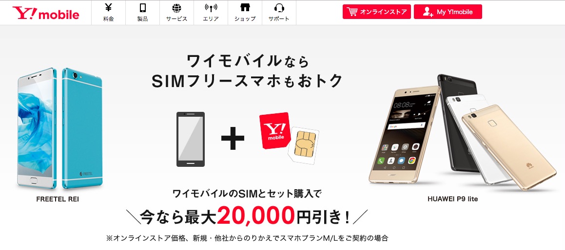 Y!mobileオンラインストアにてSIMフリースマホの販売を開始!今なら最大2万円引きで「HUAWEI P9 lite」が一括7980円、「FREETEL SAMURAI REI」が一括4890円で購入可能