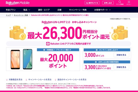 これにより、Rakuten Miniは本体価格が税抜17,000円(税込18,700円)なので実質3,000円相当となり、契約事務手数料に相当する申込キャンペーン(3,300ポイント還元)に加え、オンライン申込キャンペーン(3,000ポイント還元)によって実質0円となります。