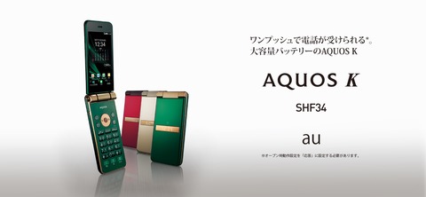 KDDIおよび沖縄セルラー電話は21日、都内にて「au HOME 発表会 with au 2017 冬モデル」を開催し、今冬以降に発売する「2017年冬モデル」として約3.4インチQHD(540×960ドット)TFT液晶を搭載したAndroidベースの折りたたみ型ケータイ(フィーチャーフォン)「AQUOS K(型番:SHF34)」(シャープ製)を発表しています。